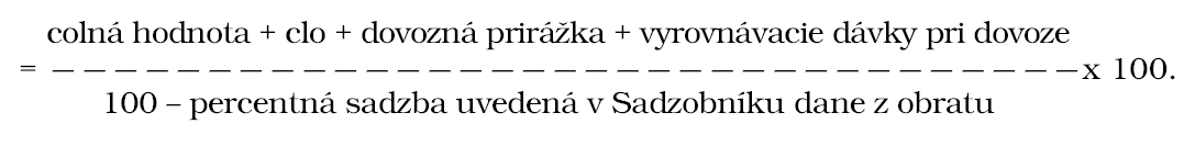 | (23) Základ dovoznej dane v prípade použitia percentnej sadzby príslušnej položka Sadzobníka dane z obratu možno tiež vypočítať podľa tohto vzorca: |