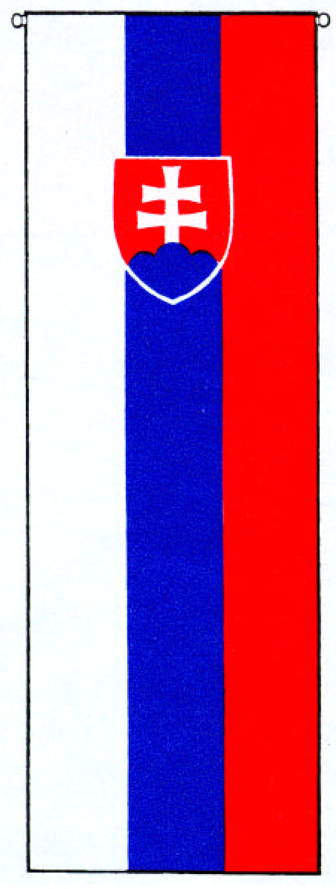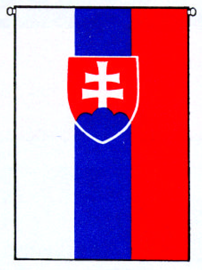 | (1) Štátna vlajka Slovenskej republiky (ďalej len „štátna vlajka“) sa skladá z troch pozdĺžnych pruhov - bieleho, modrého a červeného, rovnakej šírky, usporiadaných pod sebou. Na prednej polovici listu štátnej vlajky je umiestnený štátny znak.5) Štátny znak na štátnej vlajke je rovnako vzdialený od horného, predného a spodného okraja štátnej vlajky a jeho výška sa rovná polovici výšky štátnej vlajky. Na styku štítu s inou ako bielou farbou je biely lem, široký jednu stotinu dĺžky štátnej vlajky. V štátnom znaku na štátnej vlajke sa nepoužíva žiadna obrysová linka. Pomer strán štátnej vlajky je 2:3. |