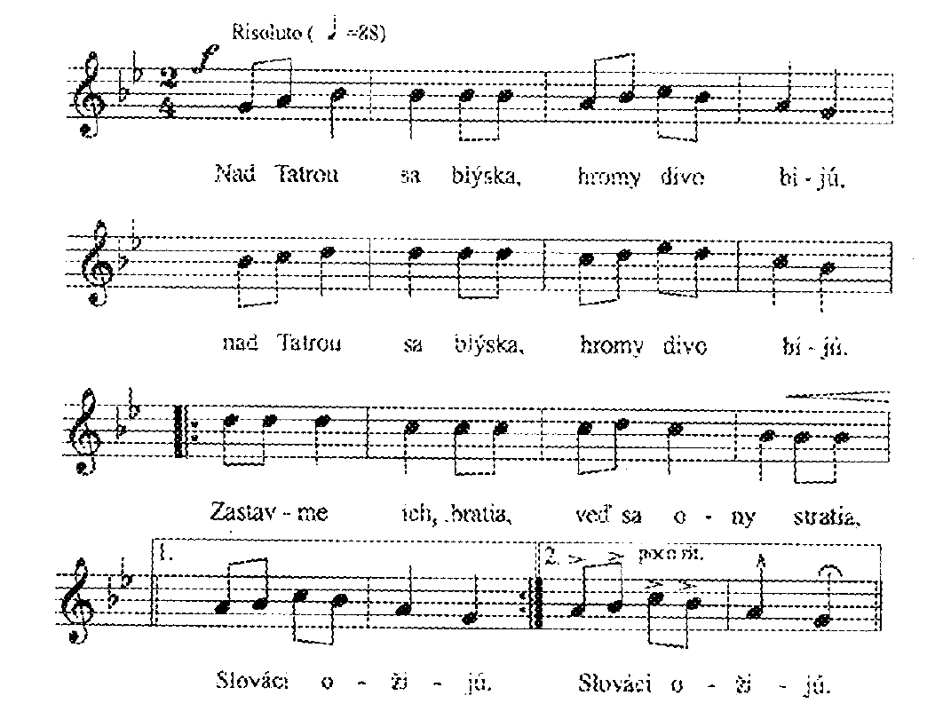 | (1) Štátnou hymnou Slovenskej republiky (ďalej len „štátna hymna“) sú prvé dve slohy piesne Nad Tatrou sa blýska.7) |