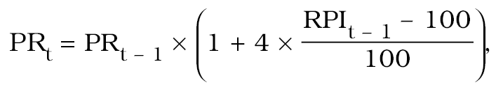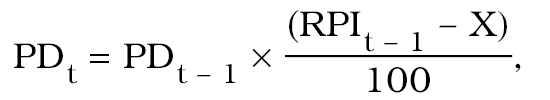 | RPIt - 1 = aritmetický priemer indexov spotrebiteľských cien, ktorým je položka „indexy spotrebiteľských cien oproti rovnakému obdobiu minulého roku, spotrebiteľské ceny úhrnom", publikovaný Štatistickým úradom Slovenskej republiky, v období od októbra v roku t - 2 až do septembra v roku t - 1, |