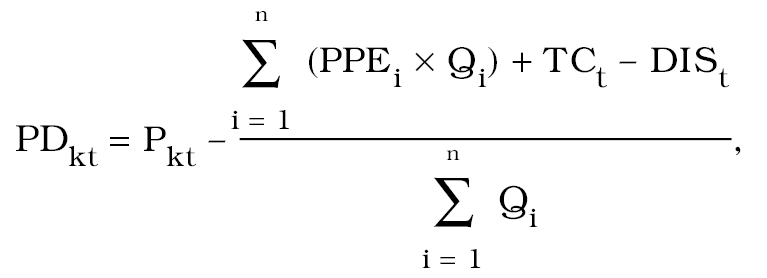 | (3) Ak cena za dodávku elektriny pre skupinu odberateľov, v ktorej sa nachádzajú alebo môžu nachádzať oprávnení odberatelia podľa odseku 1, obsahuje krížové dotácie povolené úradom, maximálna cena za distribúciu elektriny pre oprávnených odberateľov PDkt v tejto skupine sa určí ako cena za dodávku elektriny v Sk na jednotku elektriny po odpočítaní nákladov na nákup a prenos elektriny v Sk na jednotku elektriny, a to podľa vzorca: |