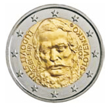 b) Na národnej strane pamätnej euromince je vyobrazený portrét Ľudovíta Štúra. Vpravo od portrétu sú v opise vnútorného kruhu v dvoch riadkoch názov štátu „SLOVENSKO“ a letopočet „2015“. Vľavo od portrétu sú v opise vnútorného kruhu v dvoch riadkoch meno a priezvisko „ĽUDOVÍT ŠTÚR“ a letopočty jeho narodenia a úmrtia „1815 – 1856“. Značka Mincovne Kremnica, štátny podnik, ktorú tvorí skratka „MK“ umiestnená medzi dvoma razidlami, je v pravej hornej časti pamätnej euromince a štylizované iniciálky autora výtvarného návrhu národnej strany pamätnej euromince akad. soch. Ivana Řeháka „IŘ“ sú v jej pravej spodnej časti. Pri okraji pamätnej euromince je dvanásť do kruhu umiestnených hviezd Európskej únie.