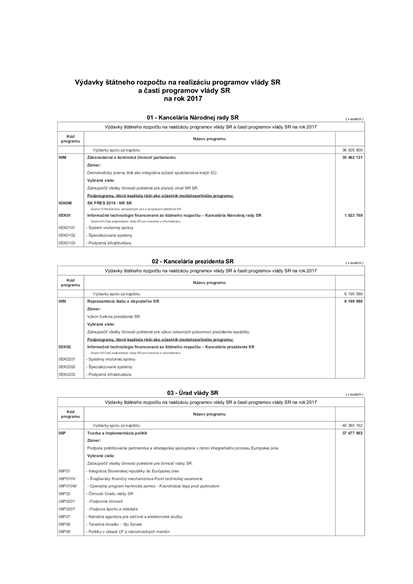 | Výdavky štátneho rozpočtu na realizáciu programov vlády SR a častí programov vlády SR na rok 2017 |