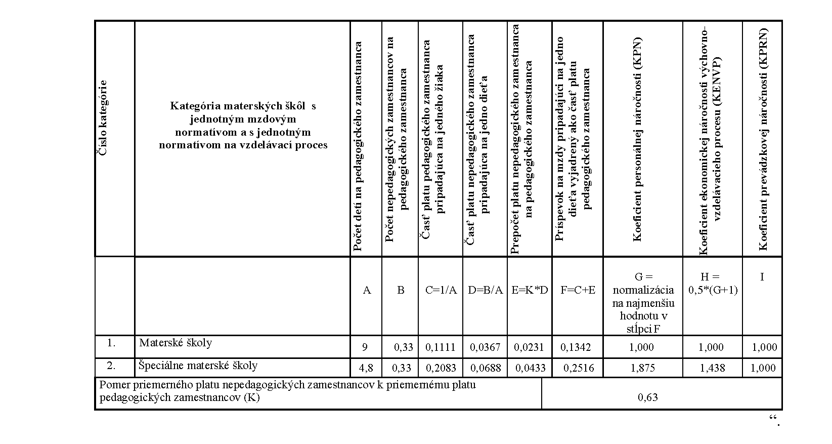 | Koeficienty personálnej, ekonomickej a prevádzkovej náročnosti pre kategórie materských škôl a špeciálnych materských škôl